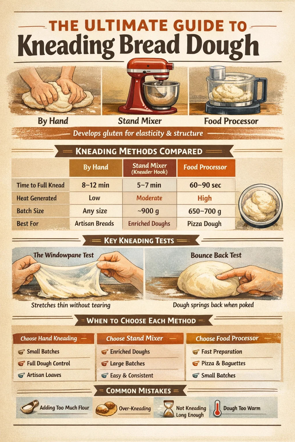 La masa de pizza con un 60-65% de hidratación es una de las masas más fáciles de amasar. Responde bien a los tres métodos. Para la pizza al estilo napolitano, el amasado manual es tradicional y produce una masa extensible y bien masticable. Para una pizza rápida entre semana, el procesador de alimentos es ideal: un lote de 500 gramos de masa de pizza puede estar listo para la fermentación a granel en menos de 3 minutos usando un procesador de alimentos, luego fermentado en frío en el refrigerador durante 24 a 72 horas para desarrollar sabor.
