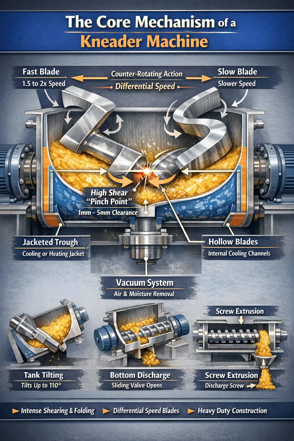 uns the blades rotate toward each other, the differential speed creates a "wiping" action. This prevents the material from simply sticking to a single blade and spinning in a circle. Instead, the material is constantly passed from one blade to the other, ensuring that every particle is subjected to the same amount of mechanical work.