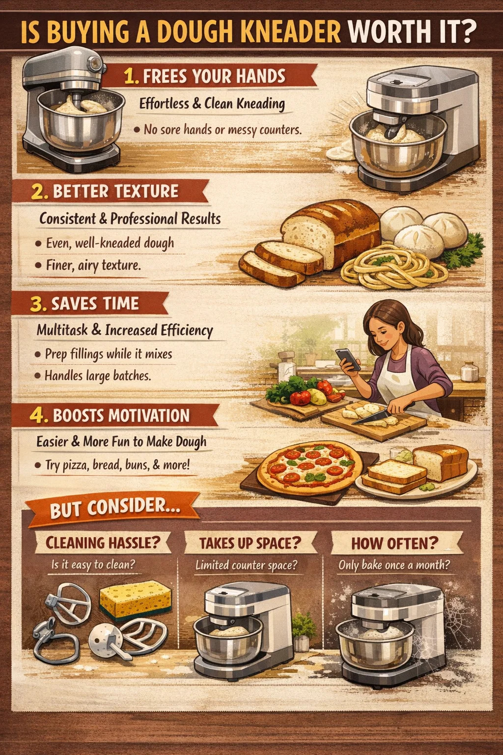 Reducir la barrera: con un equipo conveniente, estará más dispuesto a intentar preparar varios tipos de pasta (como pizza, tostadas y bollos al vapor). La máquina no se cansará ni se aflojará; te ayudará a perseverar en la cocina.