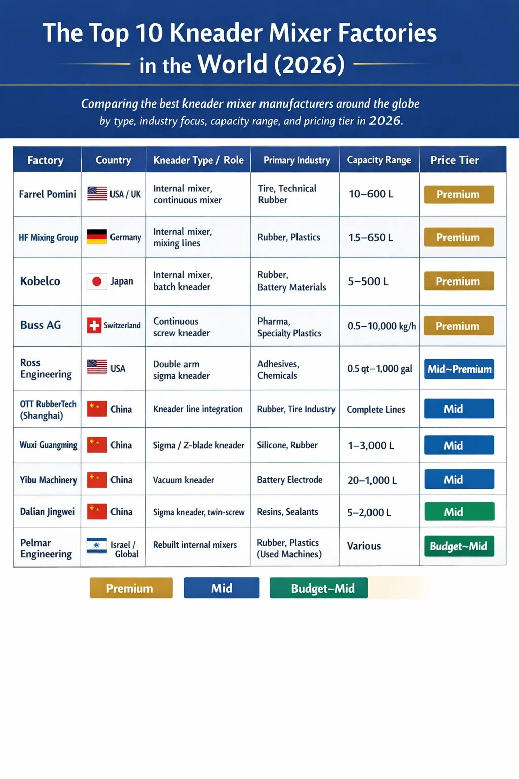Si está obteniendo un amasadora mezclador para caucho, silicona, adhesivos, materiales para baterías o cualquier compuesto de alta viscosidad, el fabricante que elija determinará directamente la vida útil del equipo, la calidad de la mezcla y el costo total de propiedad. Después de evaluar la escala de producción, las certificaciones técnicas, la base de instalación global y los comentarios de los clientes de docenas de proveedores, Las diez fábricas que consistentemente lideran el mundo en la fabricación y suministro de mezcladoras amasadoras en 2026 son: Farrel Pomini (EE.UU./Reino Unido), Grupo de mezcla HF (Alemania), Kobelco (Japón), Bus AG (Suiza), Ingeniería Ross (EE.UU.), OTT RubberTech International Trading (Shanghai) Co., Ltd. (China), Wuxi Guangming Machinery (China), Maquinaria Yibu (China), Dalian Jingwei Chemical Machinery (China) y Ingeniería Pelmar. (Israel). Cada uno aporta una fortaleza distintiva, ya sea una capacidad de torque ultra alta, un diseño sanitario de grado farmacéutico, una integración completa de la línea de amasado de caucho o precios competitivos en costos para una producción de volumen medio.